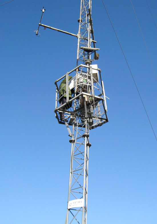 測風塔架設在風電場場址內,多為絎架式結構和圓筒式結構,采用鋼絞線斜拉加固方式,高度一般為10-150米。在塔體不同高度處安裝有風速計、風向標以及溫度、氣壓等監測設備。可全天候不間斷地對場址風力情況進行觀測,測量數據被記錄并存儲于安裝在塔體上的數據記錄儀中。